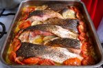 Toate legumele (mai putin rosiile) curatate, taiate rondele fine, le punem in tava pudrate cu sare, piper si usturoi taiat marunt. Deasupra punem pestele de asemenea condimentat, restul de usturoi ramas, printre bucatile de peste punem rondele de rosii si felii de lamaie, rasturnam uleiul,...