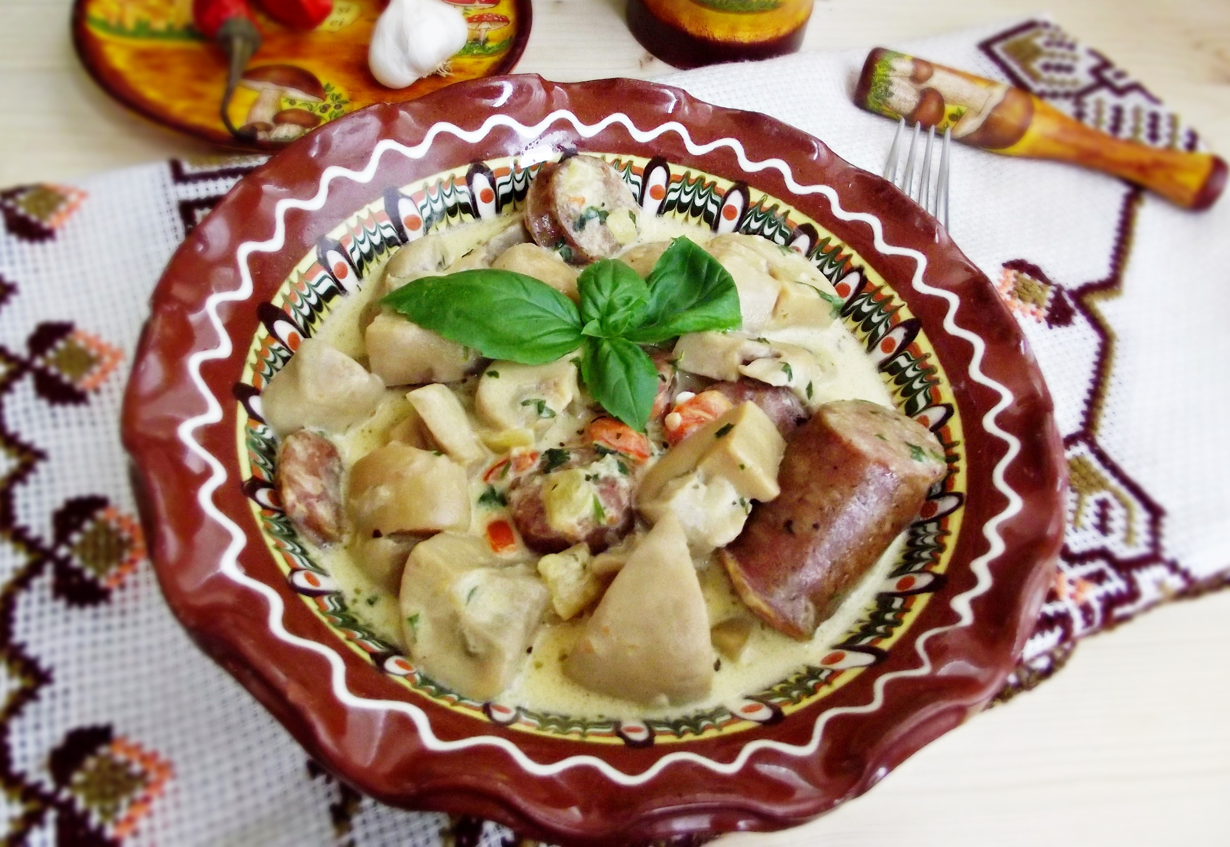 Ciuperci in sos alb, cu carnati de casa