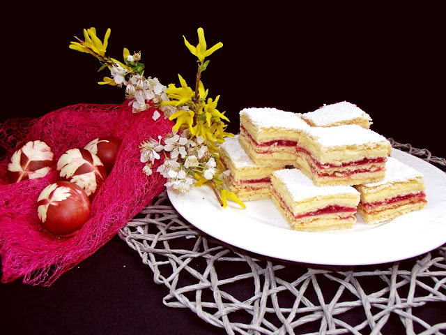 Desert prajitura cu foi, crema de lamaie si jeleu de visine