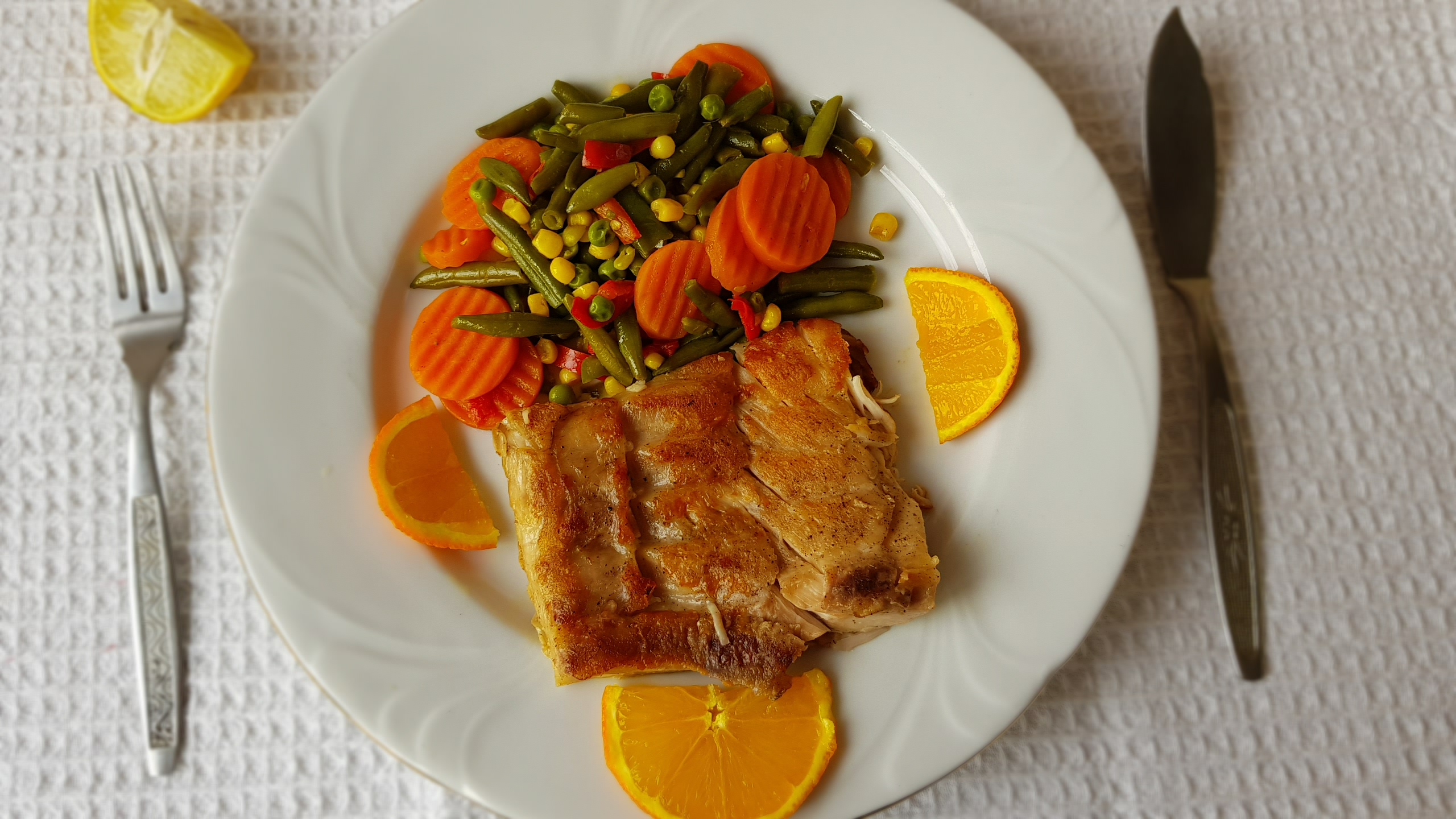 File de crap salbatic cu rozmarin si fresh de portocale, servit cu legume in unt
