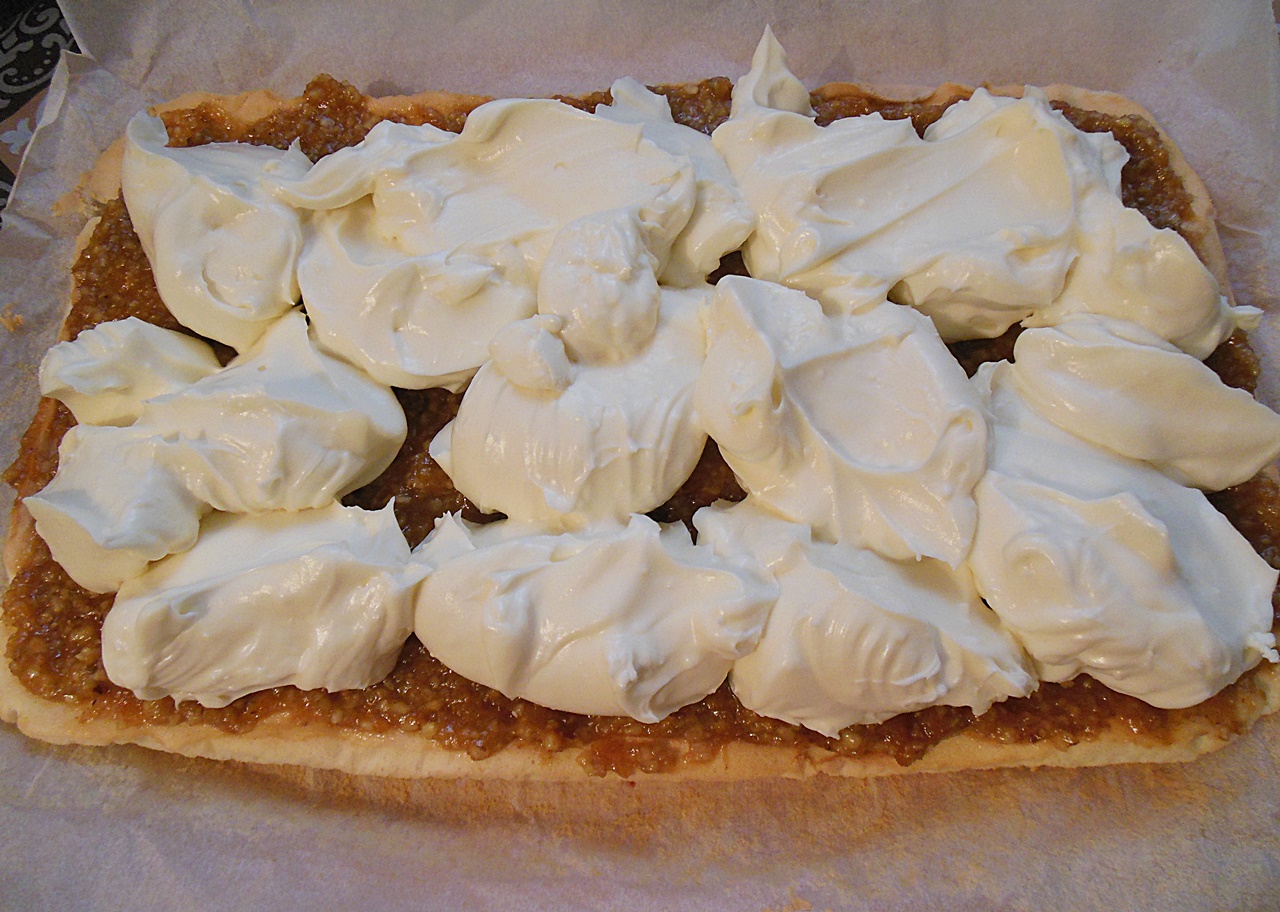 Prajitura cu crema de vanilie, gem de caise si nuca